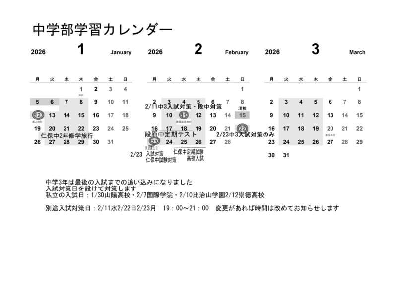 中学3年冬期講習の時間変更